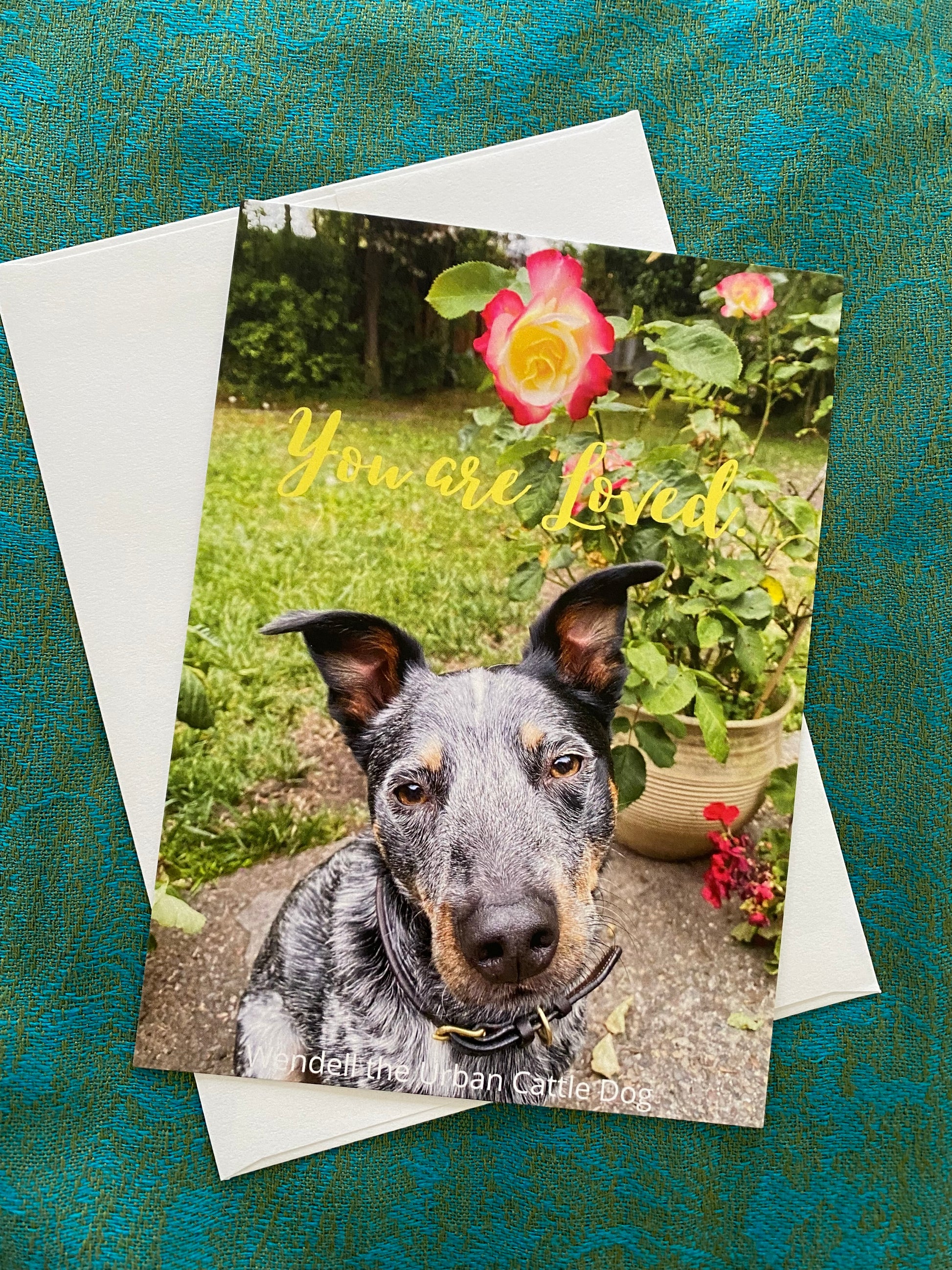 You are Loved Note Card featuring Wendell the Urban Cattle Dog. 5 by 7 inch, high quality, signature smooth cardstock. Back is blank and includes envelope and a postage stamp! All you need to do to spread a little joy is add the address and a personal note on the back. Perfect for Valentine's Day or just surprise someone anytime so they know they are loved.